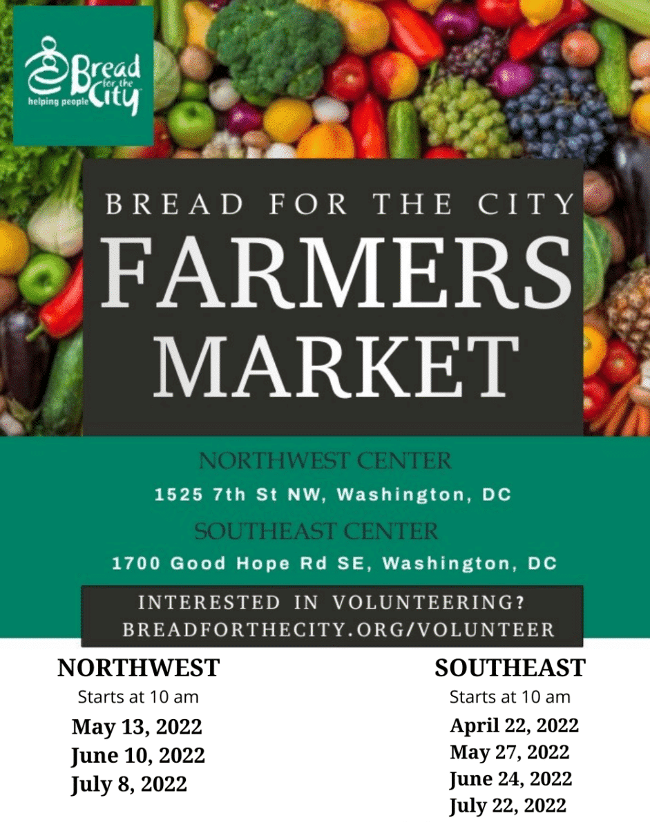 Bread for the City’s Farmers Market is open to the general public beginning at 10 am until we run out of produce. We hold the market on the second Friday of the month at our Northwest Center (1525 7th St NW, Washington, DC 20001) and the fourth Friday of the month at our Southeast Center (1700 Good Hope Rd SE, Washington, DC 20020).
